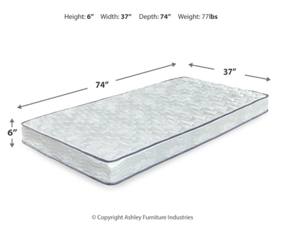 This budget-friendly firm twin mattress offers a comfortable night’s sleep at a comfortably affordable price. At the core of this mattress: 13.5-gauge tempered Bonnell steel coils that provide maximum support for a sound sleep. The mattress’ quality foam and quilted polyester fabric add an enhanced level of comfort. Foundation available, sold separately.