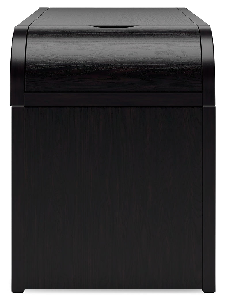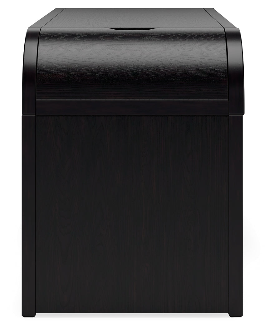 Inspired by art deco design, this softly shaped home office desk makes a lasting impression in a simply stunning way. Its magnificent curved silhouette is enhanced by a rich layered black finish on the textured wood grain surface. Complete with ample storage, a pull-out keyboard tray and USB charging, this is the all-in-one piece you’ve been looking for to elevate your contemporary workspace decor.