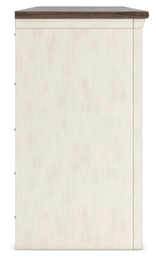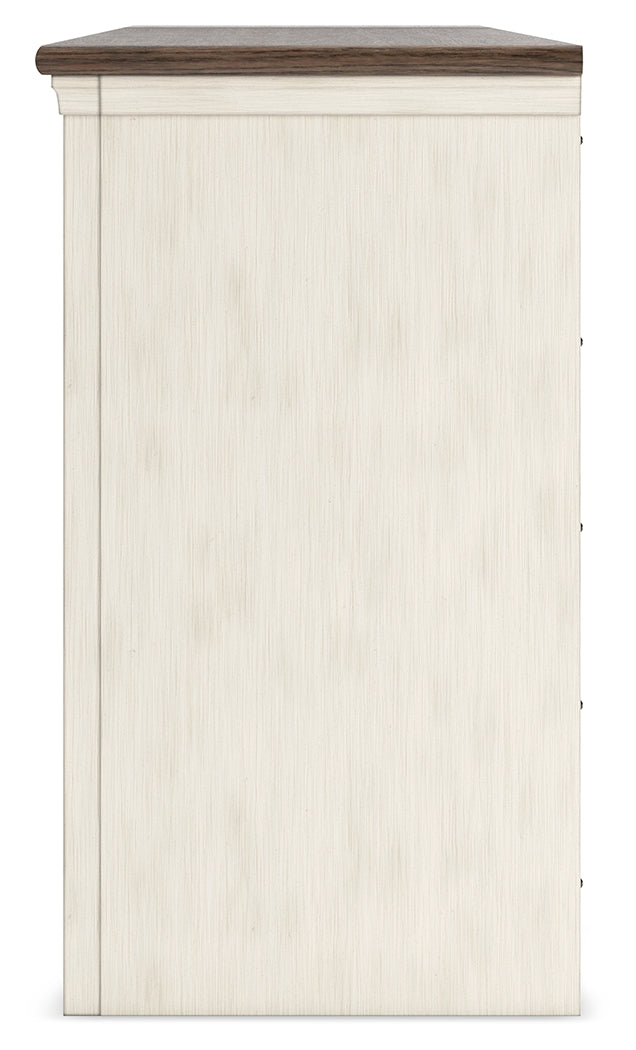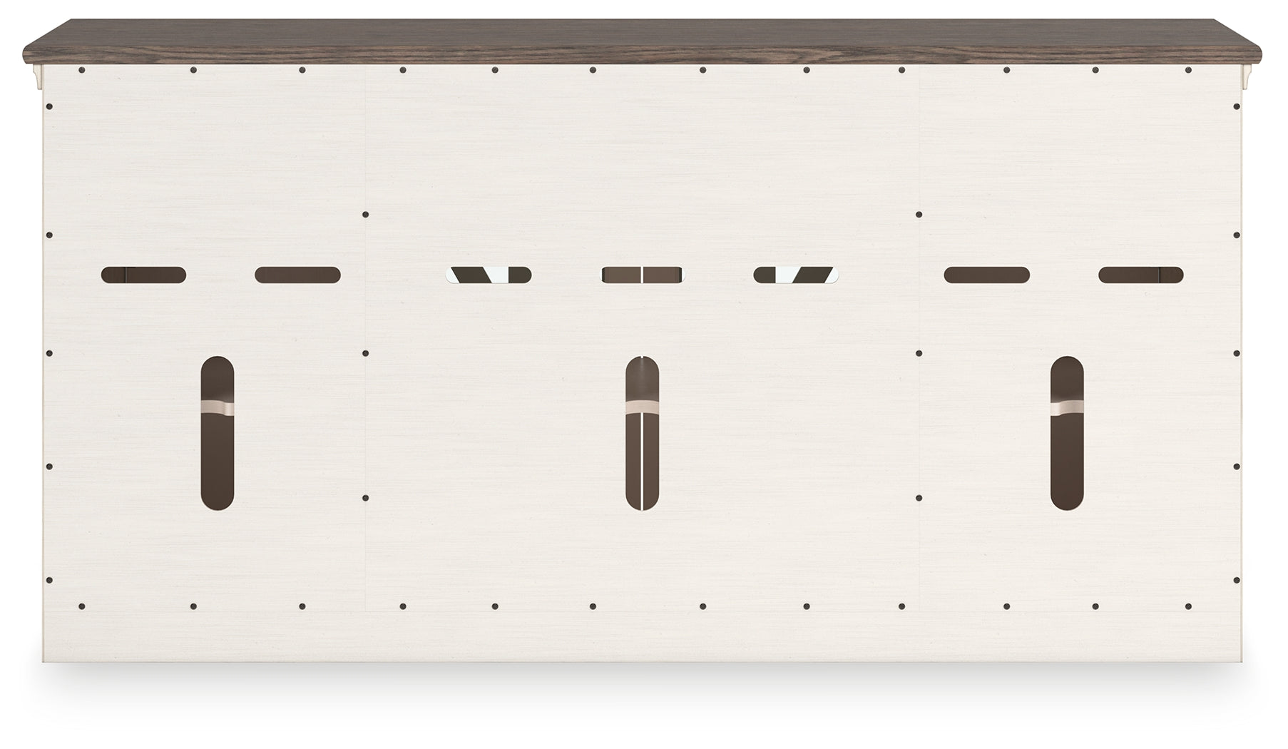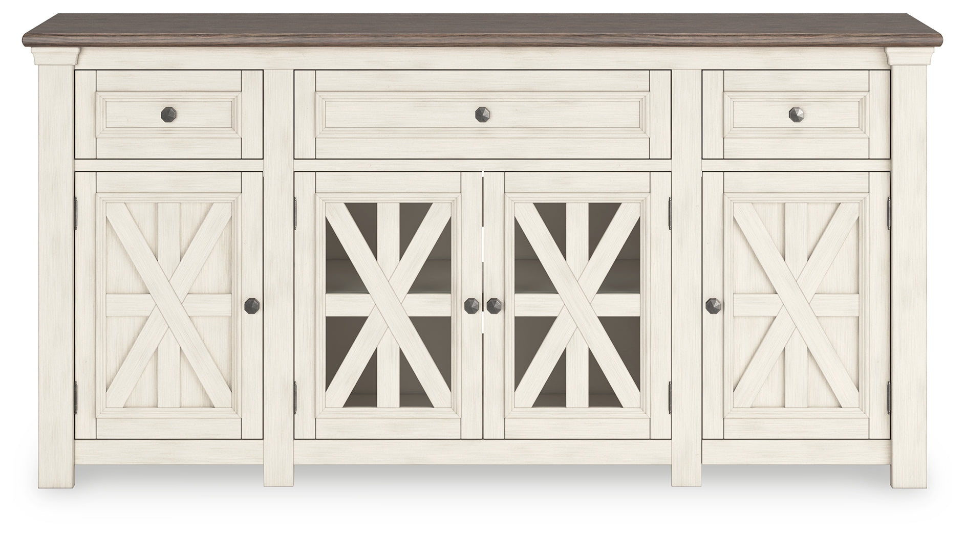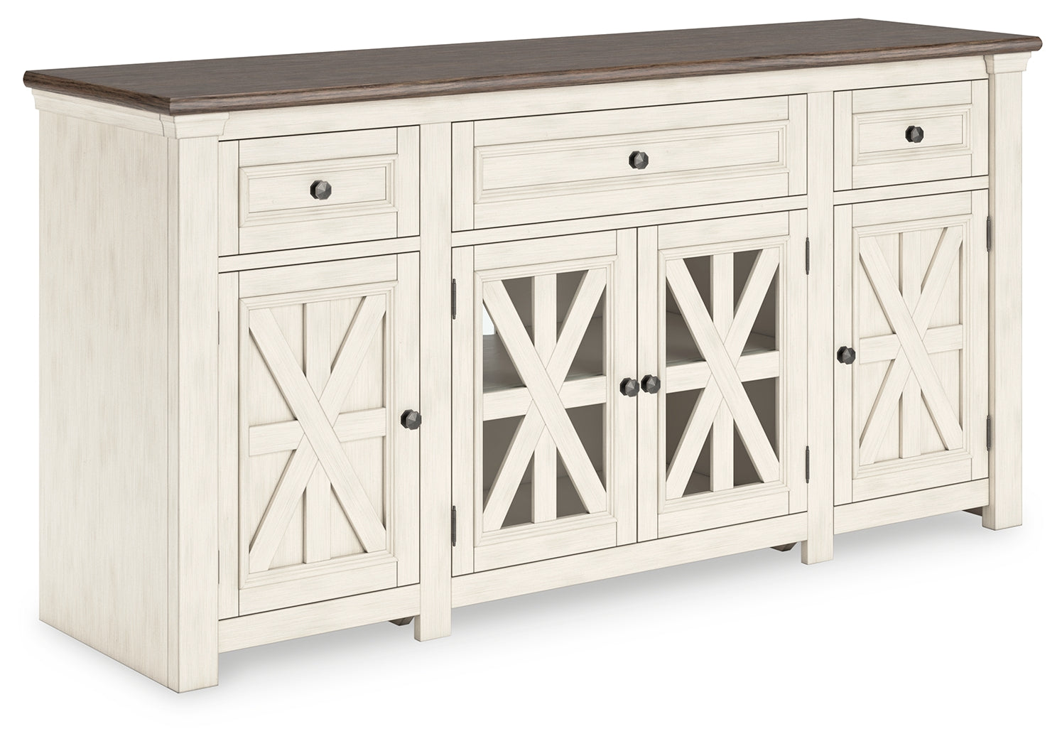 Whether your style is farmhouse fresh, shabby chic or country cottage, you’ll find this TV stand perfectly in tune. Its two-tone finish pairs a trendy textured antiqued white with weathered gray for that much more quaint character. Charming elements include crossbuck-adorned cabinet doors with glass inlays for peek-through flair. Ample storage space and cutouts for wire management nicely accommodate your media needs.