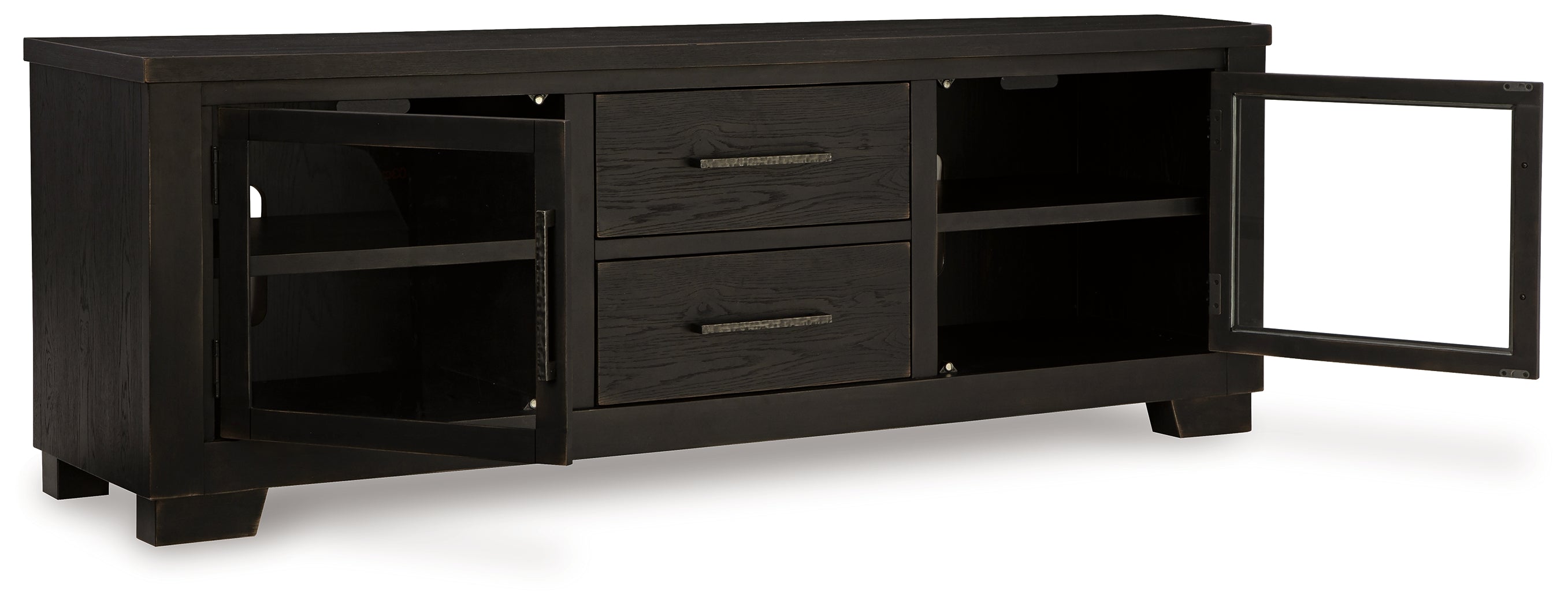 This TV stand brings a rustic vibe to urban contemporary design. It’s a modern approach to natural beauty, with the worn black finish giving your living room a gently aged charm. Console and media storage is made easy with cabinets and drawers. And the stunning simplicity of its color palette allows you to seamlessly coordinate this TV stand with your existing decor.