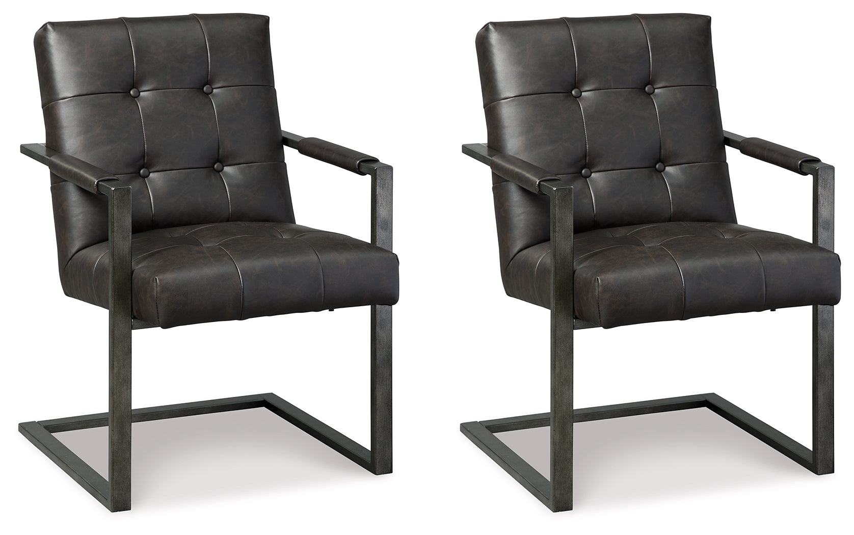 For fans of urban industrial design, this set of 2 chairs steals the show. Its metal C-frame in a blackened gunmetal finish is sleek, sculptural and ultra modern. Crafted for looks and comfort, the tufted box seat, wrapped in a "weathered" faux leather upholstery, is loaded with retro chic flair.