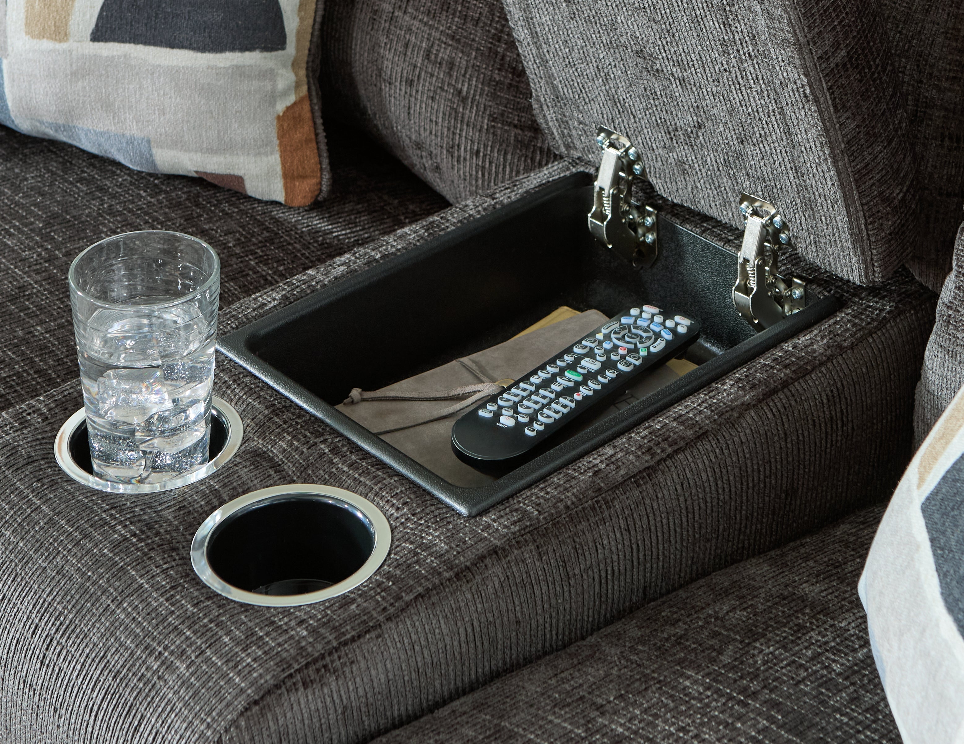 Indulgent comfort meets fashion-forward flair in this reclining loveseat with console. Its luxuriously soft upholstery and captivating color show off your cozy yet smart style. Sleek track arms infuse a modern sensibility, while the striking accent pillows make this piece even more inviting. Simple pull tab reclining puts endless relaxation within easy reach, whether you're lounging solo or with friends. Cup holders and hidden storage complete the experience.