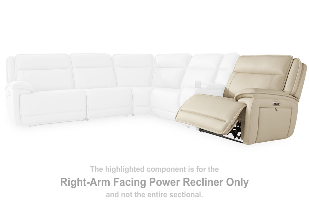 This right-arm facing power recliner is made with leather and faux leather upholstery. Pairs with other items in the series to make a sectional.
