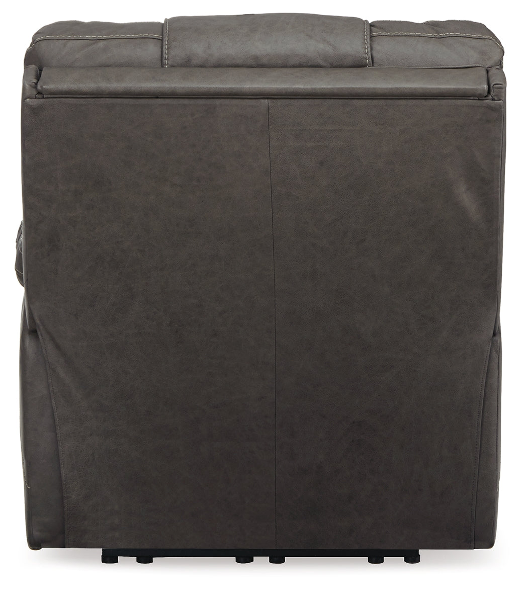 Big and bold, this power recliner with Easy View™ power adjustable headrest delivers comfort at the touch of a button. Easily position the recliner, its headrest and lumbar support to your liking for maximum comfort. Plus, with the convenient USB charging port, a cell phone or laptop can be charged without having to get up. Real leather is paired with expertly matched faux leather to level up affordable luxury. The detailing on the umber-colored upholstery creates a rustic look—perfect for your modern or casual setting.