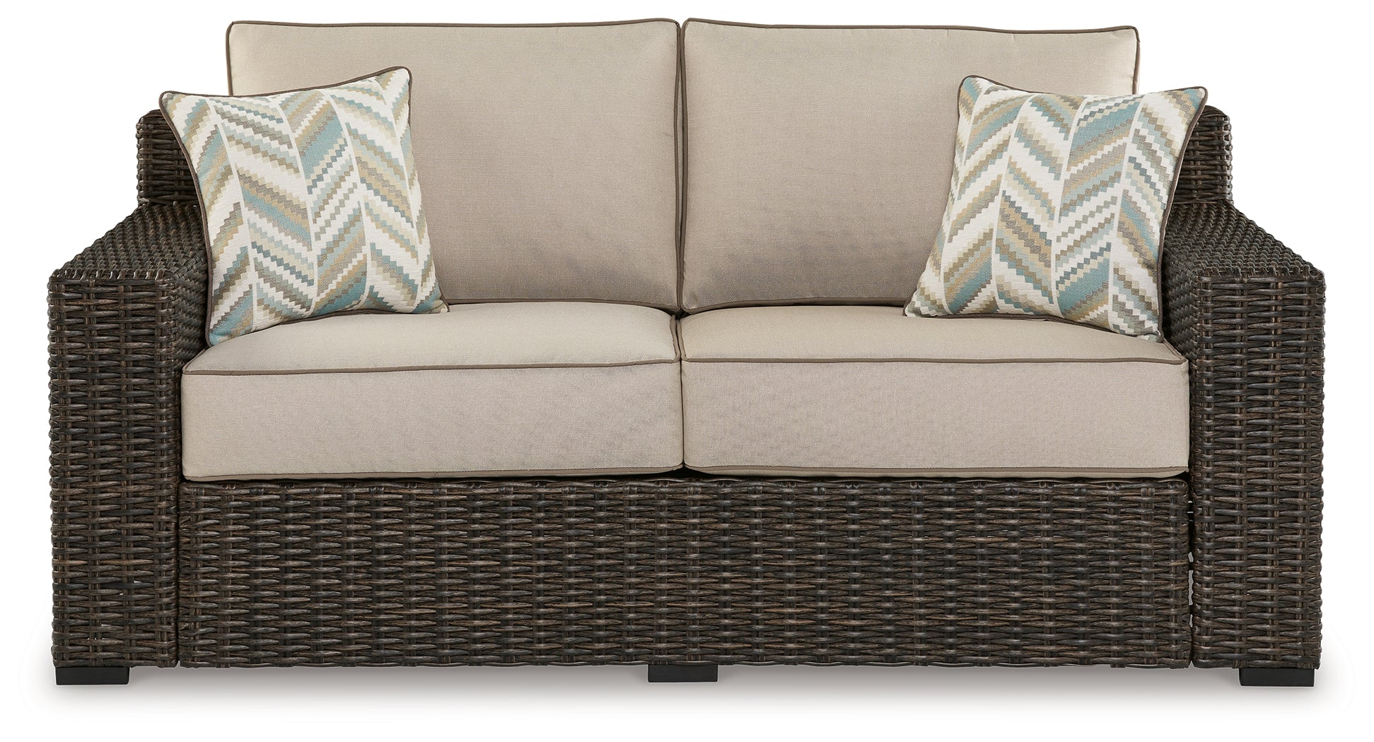 Who says the great outdoors isn’t made for luxury living? This loveseat with cushion offers all the high-end design, plush comfort and durability you could ask for, and then some. Its all-weather, rust-proof aluminum frame provides the easy-breezy wicker look you love without the high maintenance. Rest assured, the high-performing Nuvella® fabric covering the cushions and throw pillows is made to stand up to the elements.