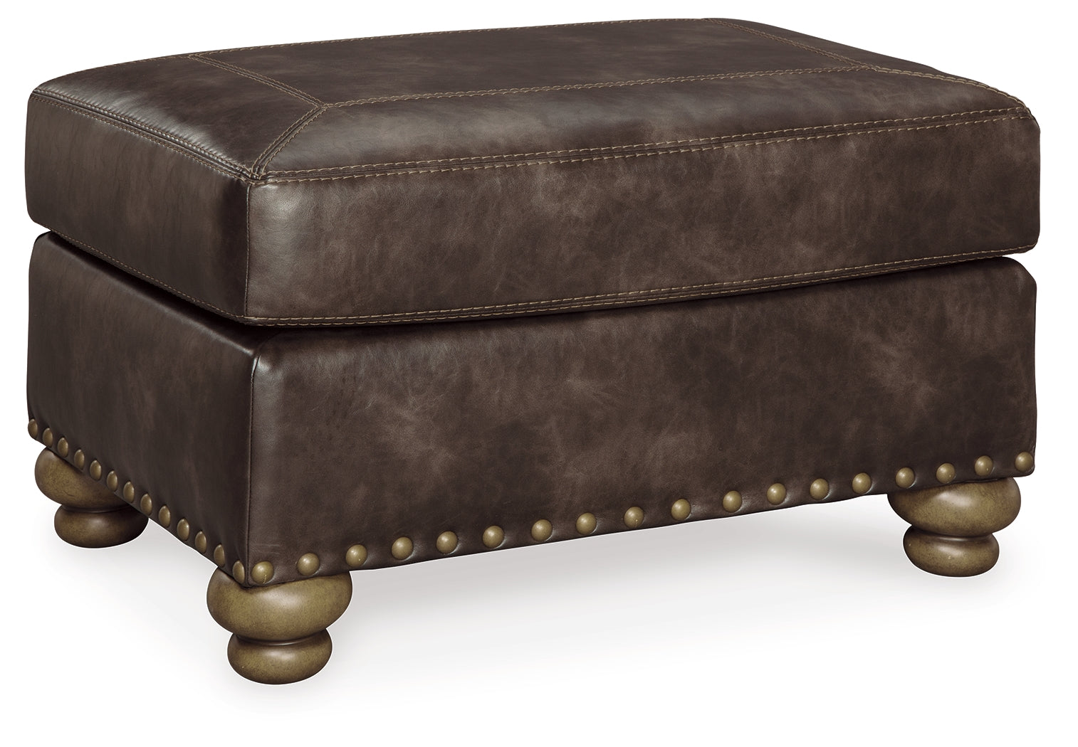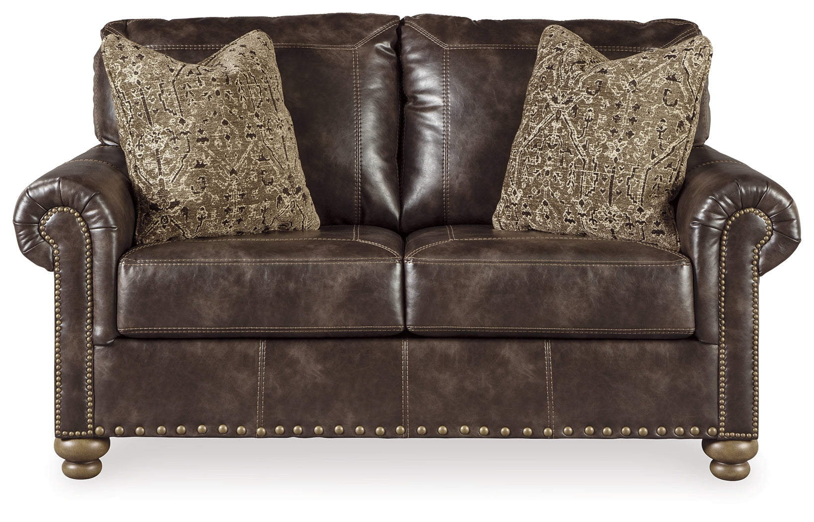 Enticing with a coffee brown faux leather, beautified with a gently weathered effect and designer stitching, this loveseat, chair and ottoman set merges a richly traditional sense of style with modern comfort. Roll arms, turned bun feet and prominent nailhead trim incorporate distinctive character, while the jacquard-patterned pillows add a sumptuous touch. Rest assured, the matching ottoman provides the perfect place to kick up your heels.