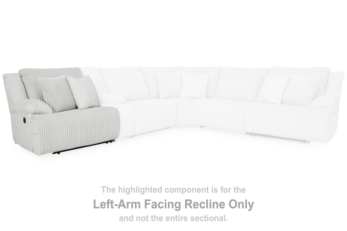 This left-arm facing recliner is made with polyester upholstery. Pairs with other items in the series to make a sectional.